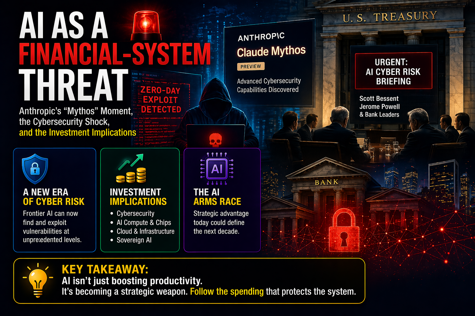 "Frontier AI just crossed from productivity tool to systemic threat. Treasury and the Fed called an emergency meeting with bank CEOs — that is not marketing. The investment case is not to chase fear. It is to follow the forced spending: cybersecurity, compute, sovereign infrastructure, and the semiconductor stack underneath all of it."