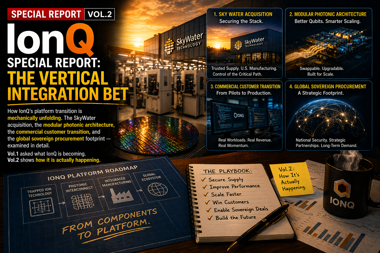 How IonQ's platform transition is mechanically unfolding. The SkyWater acquisition, the modular photonic architecture, the commercial customer transition, and the global sovereign procurement footprint — examined in detail. Vol.1 asked what IonQ is becoming. Vol.2 shows how it is actually happening.